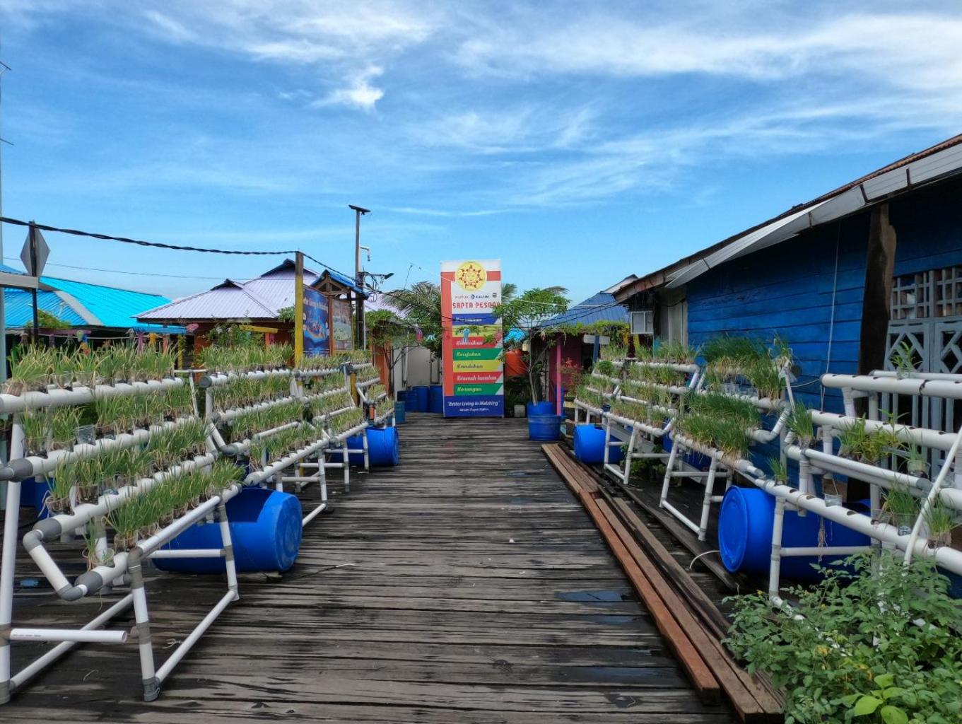 kampung yang bermukim diatas laut memiliki tanaman hidroponik yang subur dan hijau,yang bisa langsung di komsumsi