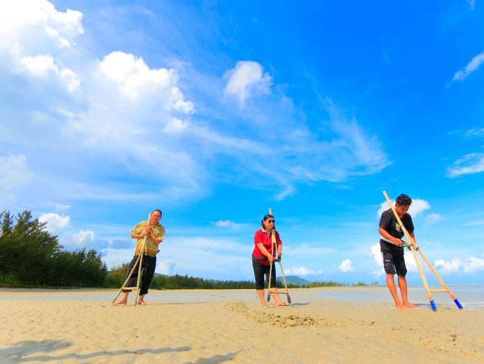 Wisata bahari di desa ini salah satunya adalah Pantai Takari. Bentang pasir putih dan barisan pohon cemara yang rapi menjadikan pantai ini tempat rekreasi yang pas untuk menggantung hammock atau sekedar membentang tikar menikmati sejuknya angin sepoi-sepoi. Berlimpahnya kerang di pantai ini menarik minat wisatawan dan masyarakat sekitar mecari kerang dengan cara menggali dan menarik menggunkan alat tangkap tradisional dari kayu atau yang biasa disebut dengan kegiatan Nyakar. Selain Takari, ada juga Pantai Cemara yang merupakan lahan pasca tambang yang dikelola dengan tetap mempertahankan ekosistem mangrovenya, dan Pantai Batu Ketak dengan ikonnya yaitu Morcusuar peninggalan Belanda.