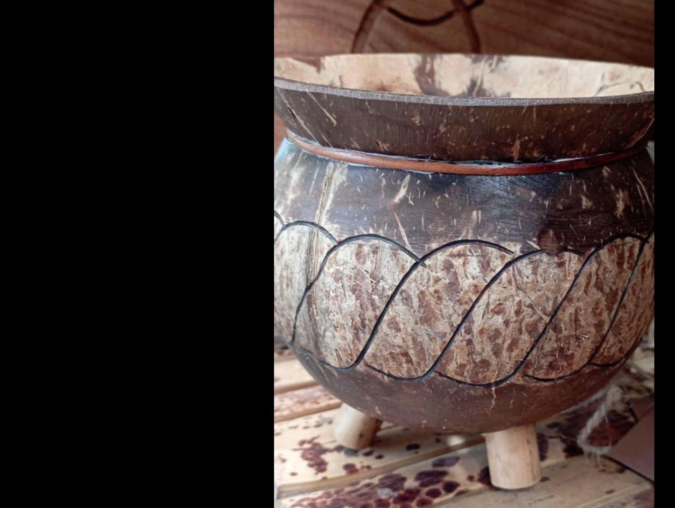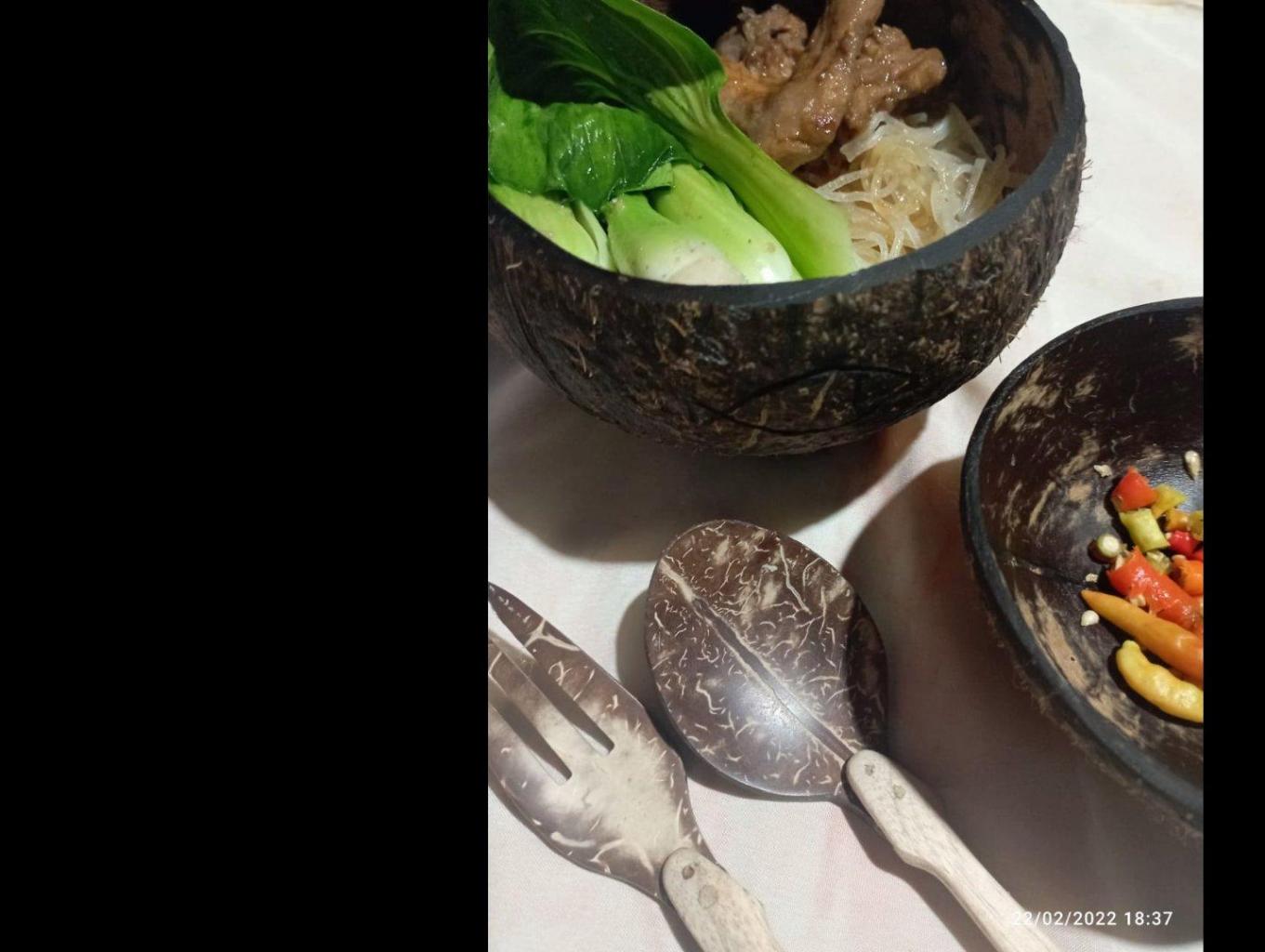 Di olah dengan cara kelapa di kupas isi buah kelapa di jadikan minyak kelapa ( minyak goreng ) batok kelapa kemudian keringkan kemudian di amplas